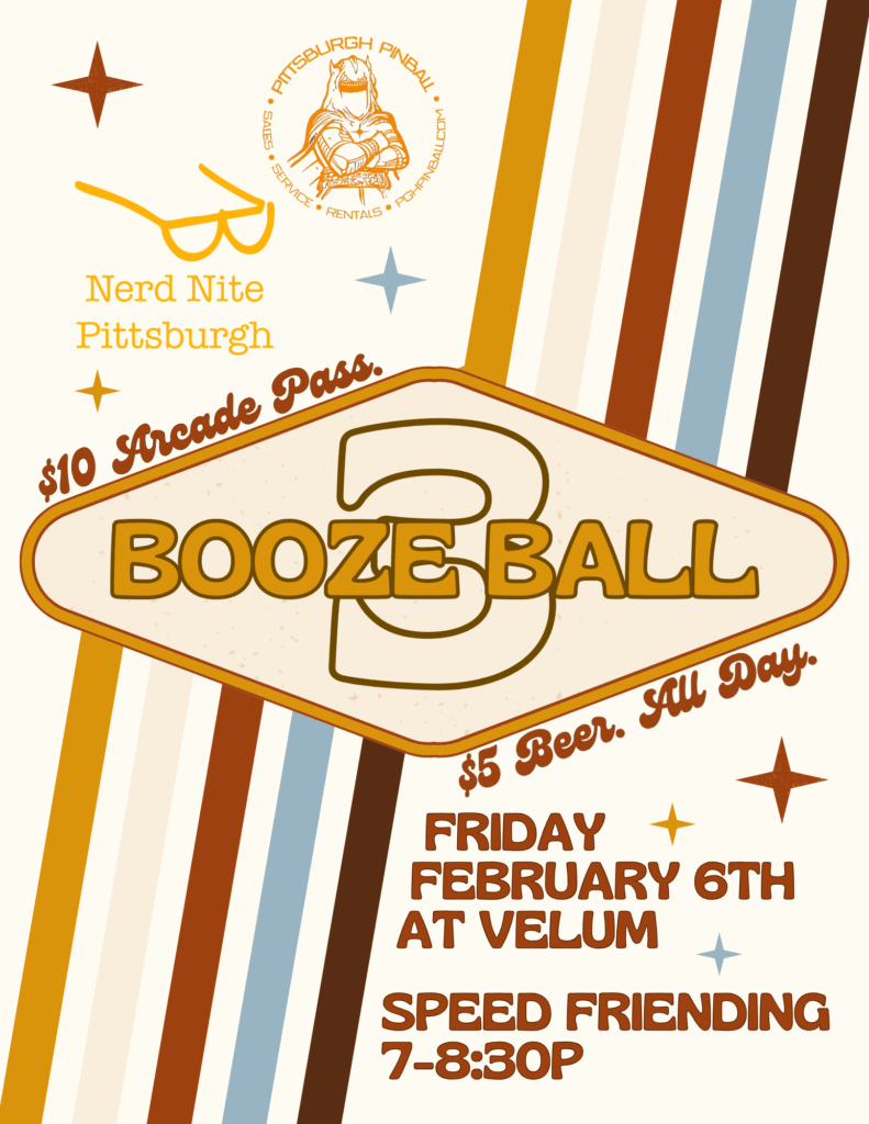 We think the event is so awesome that we’re sending our professional nerds to host speed friending from 7:00-8:30 pm. Admission to the Booze Ball includes speed friending, and the event is ticketed at the door ($10 cash or card). Pinball, arcade games, cheap yet delicious beer, meeting new nerdy friends, what more could you ask for in the depths of Pittsburgh winter?