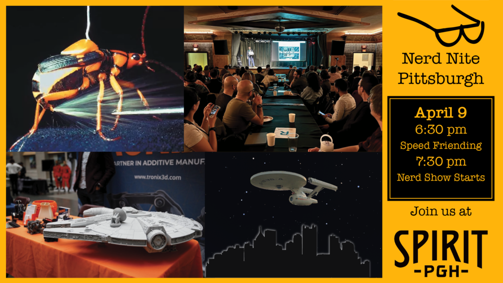 Nerd Nite Pittsburgh is a lecture series that’s a mix between a comedy show, TED talk, and a social mixer! Speakers present for 15 minutes on a variety of topics related to science and technology, popular culture, history, and other nerdery with a vibe that’s as entertaining as it is academic! Audience members can ask questions, and beforehand there is an entirely optional social game. Drinks, food, learning new and fascinating things, making friends with other nerds, we’ve got it all! The speed friending social game starts at 6:30, and then the big nerds hit the stage at 7:30. If you have a topic you are passionate about and you’d like to be a speaker at a later event get in touch at ! This event will feature the following presentations: